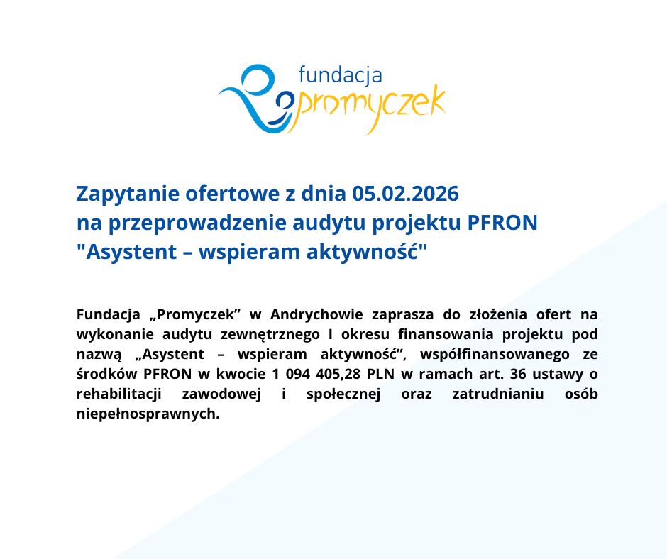 Centrum Promyczek2026-02-05T17:32:32+01:00Zapytanie ofertowe z dnia 05.02.2026 na przeprowadzenie audytu projektu PFRON „Asystent – wspieram aktywność”Centrum Promyczek2026-02-05T17:32:32+01:005 lutego 2026|