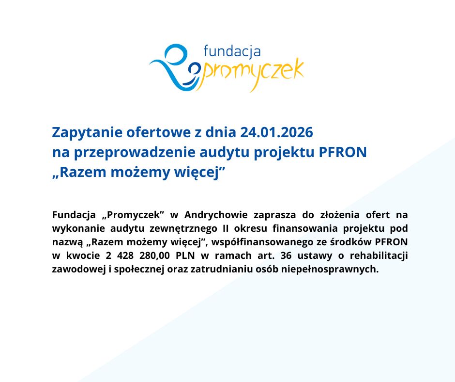 Centrum Promyczek2026-02-05T17:29:50+01:00Zapytanie ofertowe z dnia 5.02.2026 na przeprowadzenie audytu projektu PFRON „Razem możemy więcej”Centrum Promyczek2026-02-05T17:29:50+01:005 lutego 2026|
