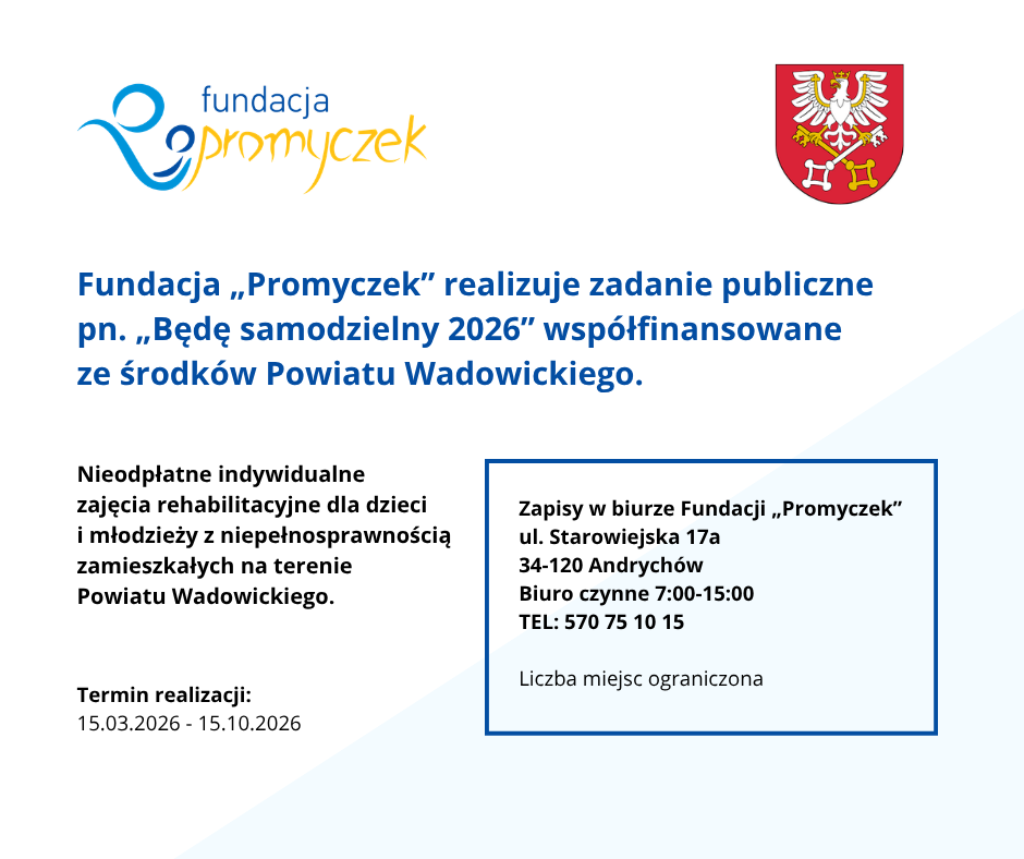 Centrum Promyczek2026-04-02T13:20:18+02:00Zadanie publiczne „Będę samodzielny 2026” realizowane przy wsparciu finansowym Powiatu WadowickiegoCentrum Promyczek2026-04-02T13:20:18+02:0015 marca 2026|