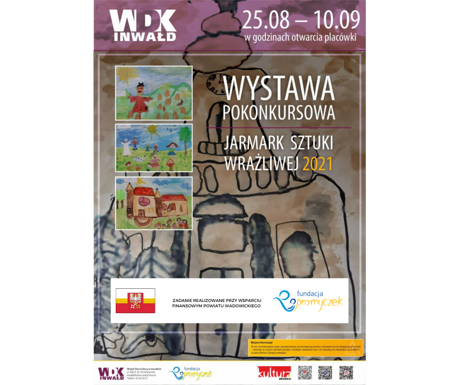 Konkurs plastyczny „Jarmark Sztuki Wrażliwej 2021” to wspaniały projekt realizowany przez Fundację „Promyczek” przy wsparciu finansowym Powiatu Wadowickiego. Dlaczego jest taki wyjątkowy? Bo artyści biorący w nim udział są wyjątkowi! 15 czerwca minął termin nadsyłania prac. W konkursie wzięli udział dzieci i młodzież – osoby niepełnosprawne, mieszkańcy Powiatu Wadowice, których pasją jest sztuka. W tym roku prace artystyczne, wykonane dowolną techniką (malarskie, rzeźbiarskie, ceramiczne, fotografia oraz inne), inspirowane były historią, kulturą i tradycją powiatu Wadowice, są jednocześnie artystyczną wizytówką Powiatu. Spośród nadesłanych prac plastycznych Jury wyłoniło zwycięzców: